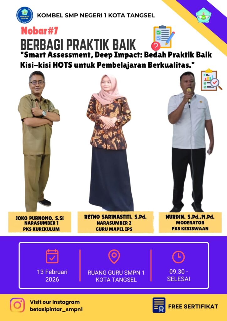Tangerang Selatan, 13 Februari 2026 – Semangat belajar tanpa henti ditunjukkan oleh tenaga pendidik SMPN 1 Kota Tangerang Selatan. Tepat setelah rangkaian kegiatan Munggahan Ramadhan usai, sekolah melanjutkan agenda dengan menggelar pertemuan Komunitas Belajar bertajuk Nobar#7 Berbagi Praktik Baik. Mengusung tema “Smart Assessment, Deep Impact: Bedah Praktik Baik Kisi-Kisi HOTS untuk Pembelajaran Berkualitas”, kegiatan ini menjadi bukti nyata komitmen guru dalam meningkatkan kompetensi profesional.
